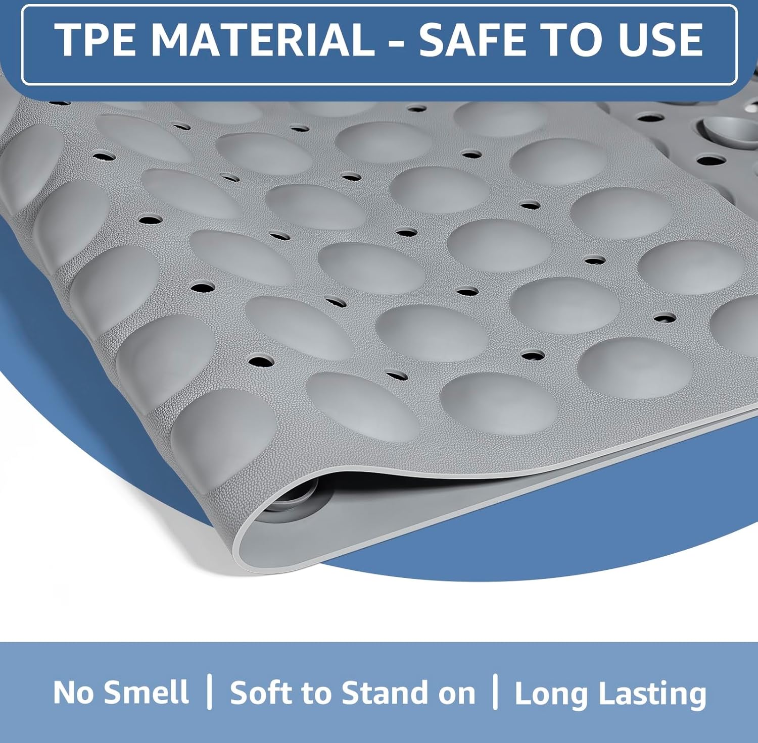 • Extra Long Size & Soft TPE Material: Measuring in at 39” L x 16” W, this non slip bathtub mat is long enough to cover entire tub floor. To enhance overall comfort, this bath mat for tub non slip is crafted from an advanced material named TPE which is odorless, soft to stand on and doesn’t discolor or deform over time